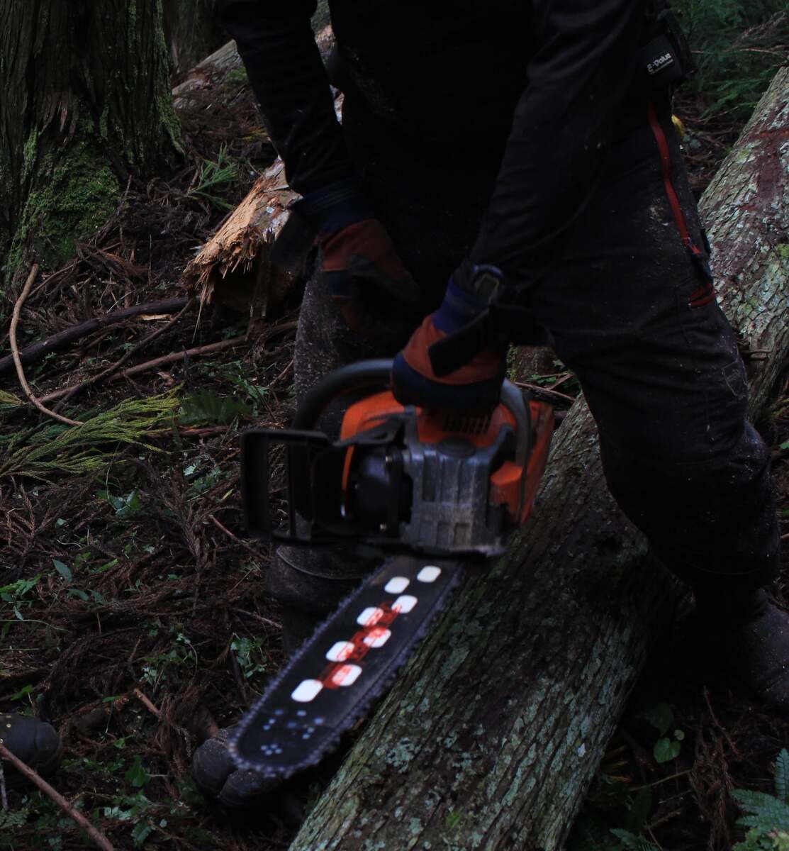 いよいよ伐採!木を伐る前に伐倒方向を念入りに確認していきます。木が倒れる際に他の木と干渉してしまったり、道路や電線にかかったりすることがないように。確認ができたら、チェンソーで斜めと横から2回切り込みを入れて受け口を作ります。受け口に対して90度の方向に木は倒れるので、微調整しながらチェンソーの刃を入れていきます。バイクのエンジンのようなチェンソーの音が鳴り響く中で、パキパキと木が倒れ始める音が…!狙った方向にだんだんと倒れ始め、ドォーーン!と大きな音を立てて木が倒れていきました!東栄町に来てから、よく森の中から大きな音が聞こえていたのですが、それが伐採の音だったのだと、この時初めて知りました。
