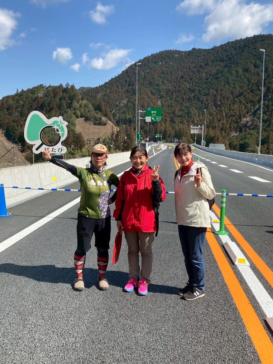 トンネルの外に出ると、佐久間方面に向けて道路がきれいに伸びていました。歩いたトンネルを超えて左に曲がれば東栄ICです。3月14日からはこの道を自動車やバイクが走ってくるのですね。皆さんをお待ちしております。外は4月の陽気、しかし、トンネルの中は涼しく、一枚はおる物が必要なくらいの寒暖差がありました。この日は、花粉の飛散量も多かったようで、トンネルの中ではくしゃみの音が響いていました。(私も響かせた一人です。)