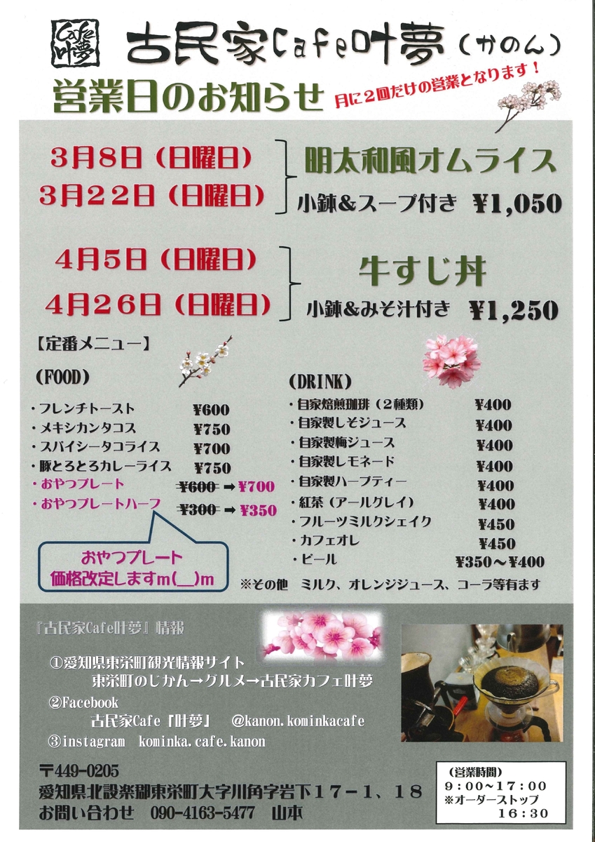 東栄町川角地区の古民家cafe「叶夢(かのん)」さんの令和8年3~4月の営業情報を更新しました。
