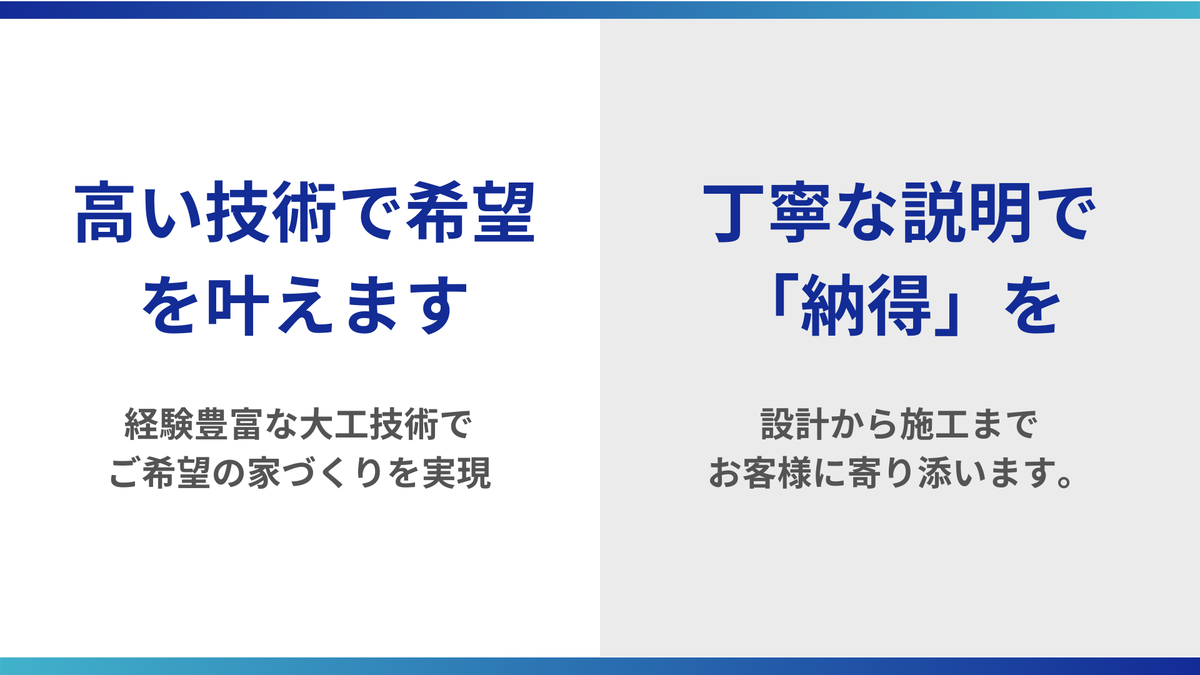 建築工事 大工工事 屋根工事 タイル・れんが・ブロック工事 内装仕上工事 など、幅広い住まいに関する施工に対応可能です。ご相談や予算に応じて対応できますので、気軽にご相談ください。