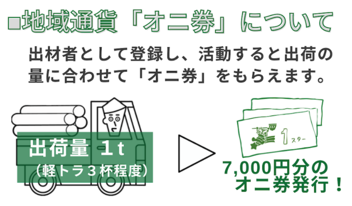 出材体験をすると地域通貨の「オニ券」がもらえます。