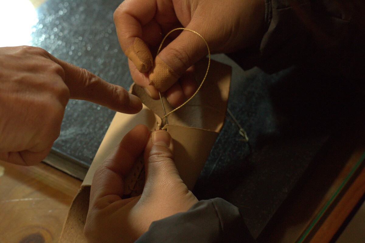 穴をあける作業、ひとつずつ開けた穴を針と糸で縫い、丁寧に仕上げていきます。