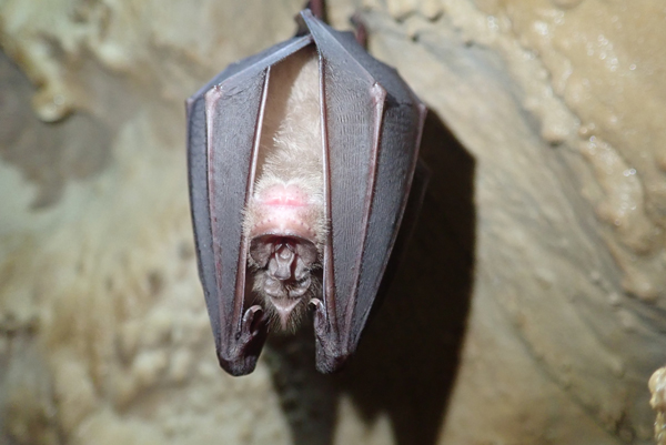 洞窟に入ると早速、天井に逆さまにぶら下がっているコウモリさんたちが。寒い時期は冬眠していて仮死状態にあるそうで動きません。さあ、ツアースタートです!