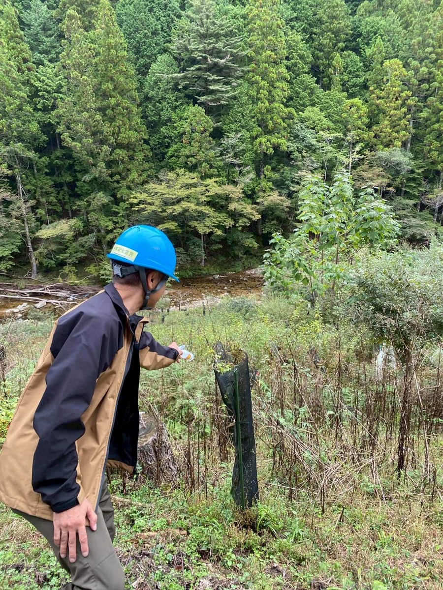 最初に案内していただいたのは、コナラの植栽地。ここでは広葉樹であるコナラを試験的に育てています。苗を植えてもシカやカモシカといった動物たちにすぐに食べられてしまう現状…。そんな被害を防ぐために、苗木一本一本にネットを被せていきます。