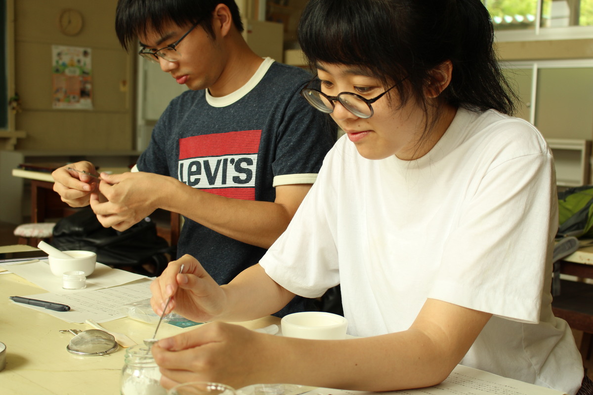 材料はすべて白い粉でしたが講師がそれらの名前と効果を説明してくれました。東栄町で採掘されたセリサイトのそのほかの特徴として海外産の黄色みがかったセリサイトに比べて、純度が高いことが挙げられます。材料である粉をレシピ通りに入れて乳鉢からこぼれないように混ぜました。よく混ぜた後、自分好みの精油を香りづけのために選んで入れました。