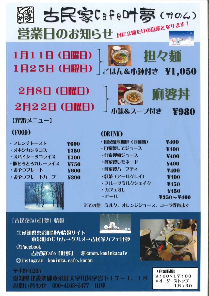 東栄町川角地区の古民家cafe「叶夢(かのん)」さんの令和8年1~2月の営業情報を更新しました。