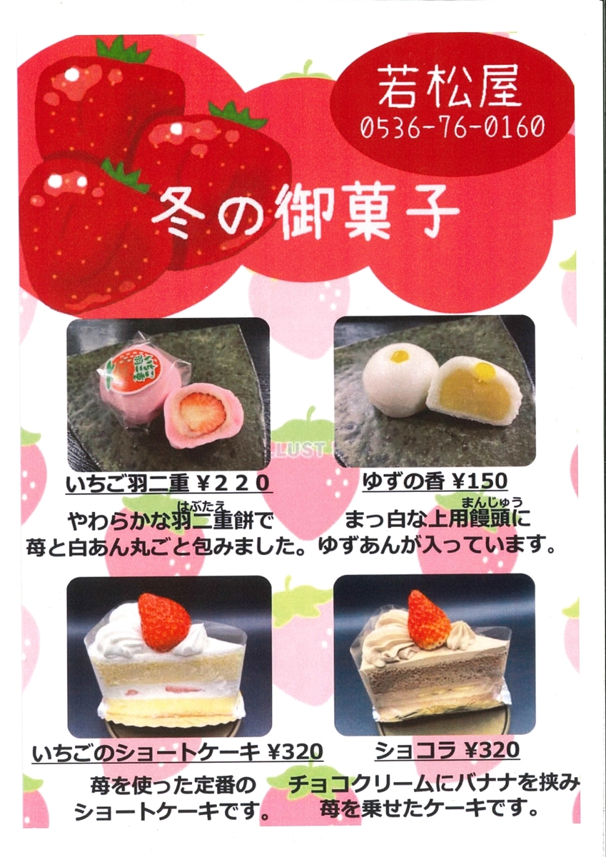 2026年2月17日(火) 「若松屋製菓」冬の御菓子販売のおしらせ 若松屋製菓より、冬の御菓子の販売のおしらせです。 PDFのダウンロードはこちら(PDF / 1.48MB) お役立ち 交通アクセス ガイドブック フォトギャラリー MAP 東栄町観光まちづくり協会について お問い合わせ ニュース&トピックス 2026年2月17日(火) 【東栄シェア会】スターフォーレストでホシゾラじかん 2026年2月28日(土) 三遠南信自動車道 東栄IC〜鳳来峡IC 開通メモリアルプレイベント つなぐつながる奥三河 2026年3月6日(金) おしごと見学会 2026年3月8日(日) 和太鼓交流プロジェクト「絆」 2026年3月15日(日) 小・中学生向け特別企画 尾籠岩山山登り体験 2026年3月22日(日) 協力隊オープンデー(東栄町地域おこし協力隊 活動報告会2026) イベント一覧へ 1 2021年8月7日(土) 東栄町自慢の錦爽鶏グルメを食べよう! 2 2017年7月25日(火) 甘酸っぱくて、美味しい東栄町のブルーベリー 3 2022年10月13日(木) プレミアム付商品券でお得に!東栄町ライフを満喫しよう 4 2018年1月15日(月) 月地区にオープンした「古民家ダイナー月猿虎」に行ってきました! 東栄町ごはんBOOKダウンロード 特集一覧へ グルメ 体験 地域活性 イベント 飲食店 お土産 自然 アウトドア 手作り 特産品