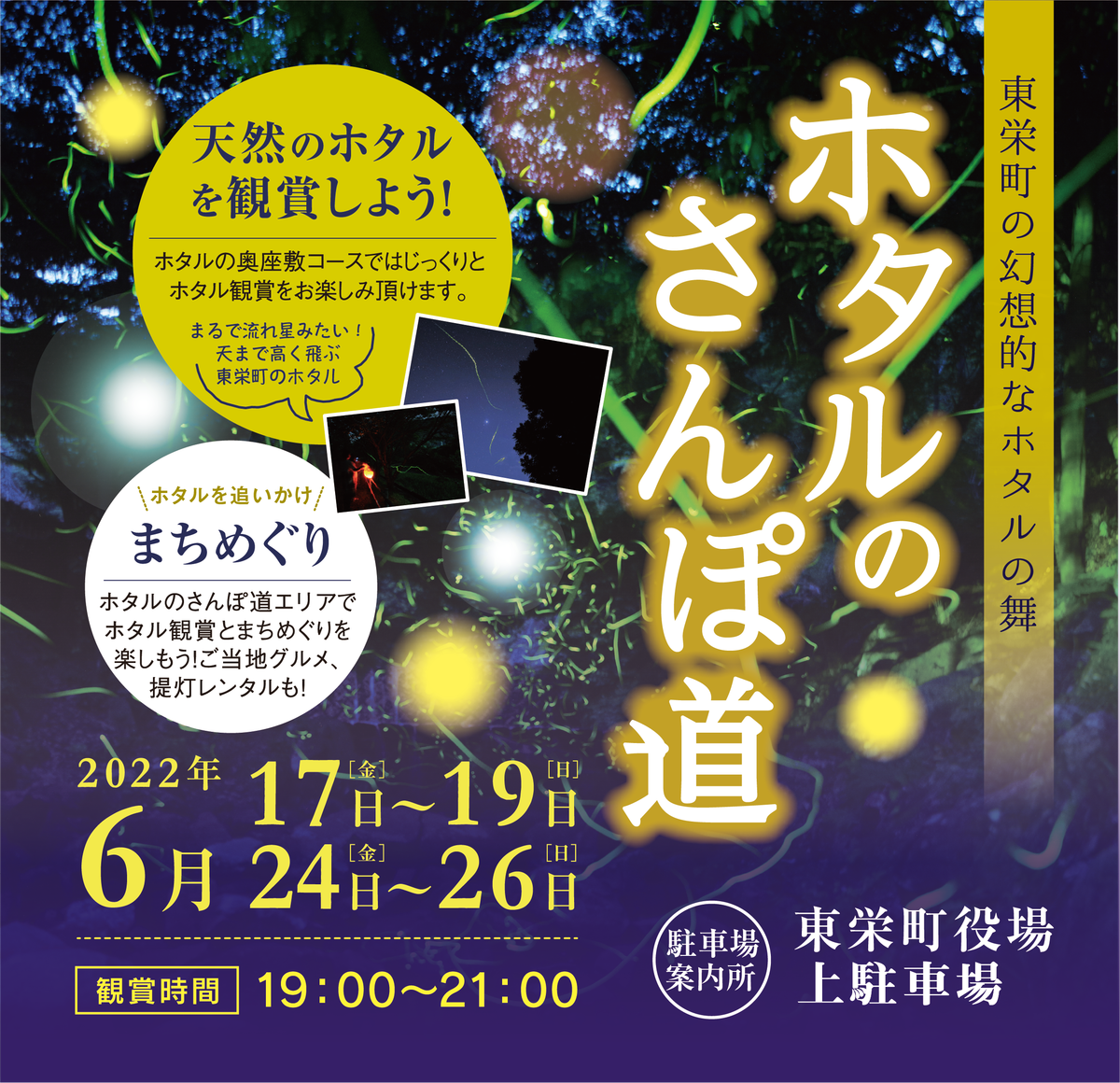 ホタルのさんぽ道では、ホタルの観賞だけでなく、東栄町のまちをゆったり散歩する時間や108マーケット、屋台村でのグルメや買い物を楽しんでいただける会場やコースを用意しています。