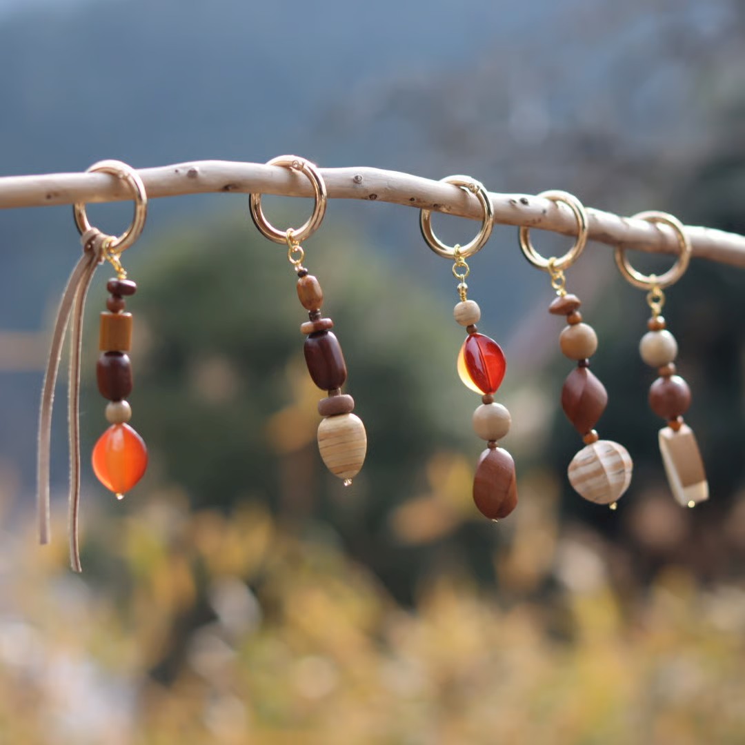旅をしながらビーズアクセサリーを手がけるKiramekiさんの、旅の途中の出会いから生まれた、すべて一点物の天然木ビーズを使ったカラビナチャーム。