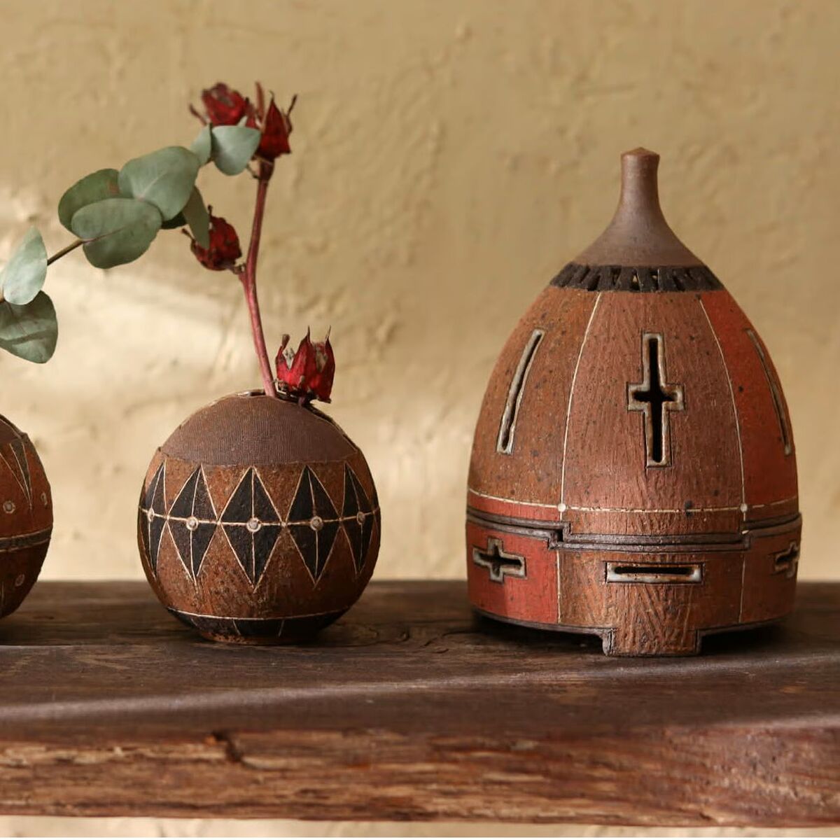 土の表情を生かした素朴さの中に手で施された幾何学模様のコントラストが映える作風は、個性的でありながら空間と調和し、生活に彩りを与えます。